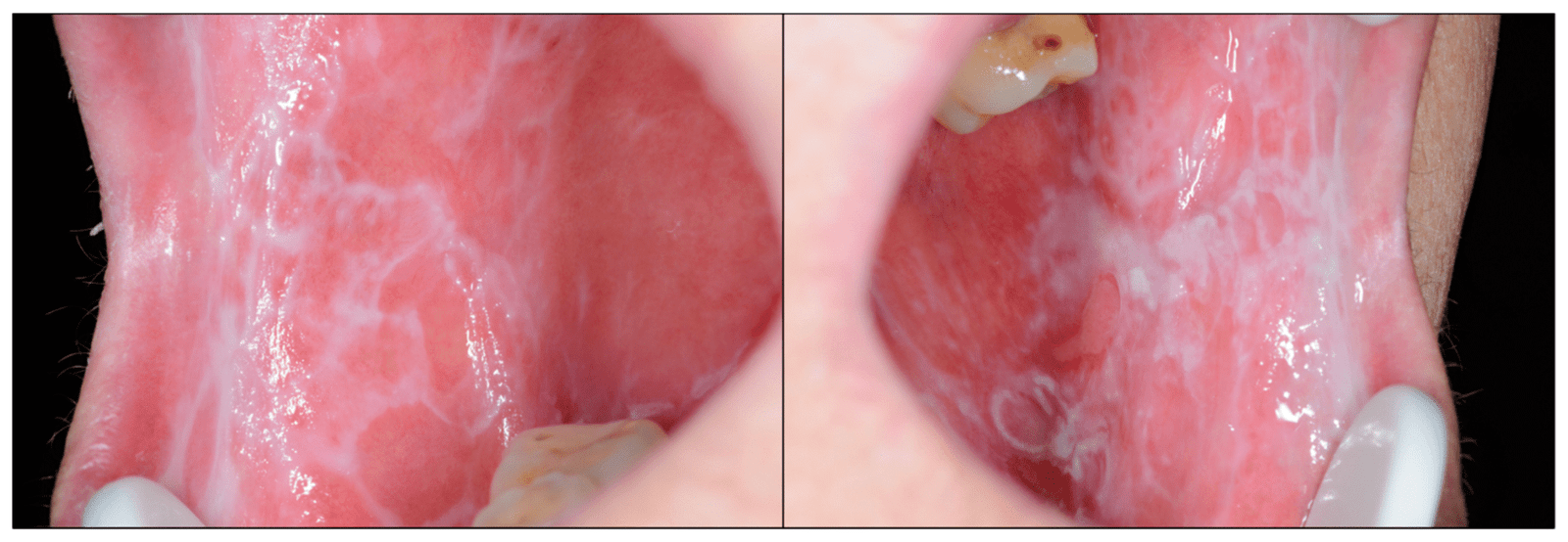 - Yra lichenoidinis pažeidimas burnoje (balkšvas tinkliukas, erozijos).